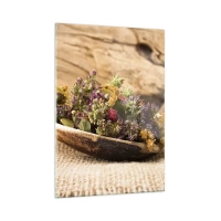 Glasbild - Bild auf glas - Getrocknete Kräuter in einem Holzlöffel auf rustikalem Hintergrund - 50x70cm - Bunte Blumen und duftende Kräuter - Moderne Wanddekoration für Wohnzimmer und Schlafzimmer ARTTOR