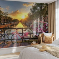 Fototapete Standard Eco - Brücke über den Kanal mit Fahrrädern bei Sonnenuntergang - 100x70cm - Frühlingsmorgen in Amsterdam - Moderne Wanddekoration für Wohnzimmer und Schlafzimmer ARTTOR