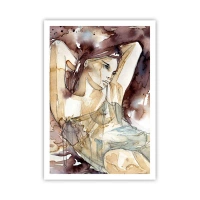 Glasbild - Bild auf glas - Frau im künstlerischen Aquarellstil mit braunem Hintergrund - 70x100cm - In lila Stimmung - Moderne Wanddekoration für Wohnzimmer und Schlafzimmer ARTTOR