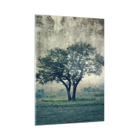 Glasbild - Bild auf glas - Ein einsamer Baum in einer Vintage-Landschaft - 50x70cm - Ein Apfelbaum auf blauem Feld? - Moderne Wanddekoration für Wohnzimmer und Schlafzimmer ARTTOR