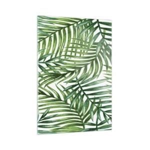 Glasbild - Bild auf glas - Grüne Palmblätter auf weißem Hintergrund erzeugen ein geometrisches Muster - 50x70cm - Unter dem grünen Baldachin - Moderne Wanddekoration für Wohnzimmer und Schlafzimmer ARTTOR
