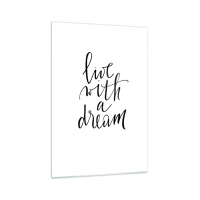 Glasbild - Bild auf glas - Ein minimalistisches Gemälde mit den Worten „Lebe mit einem Traum“ in Schwarz auf weißem Hintergrund. - 70x100cm - Na sicher - Moderne Wanddekoration für Wohnzimmer und Schlafzimmer ARTTOR