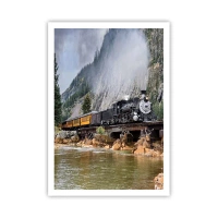 Glasbild - Bild auf glas - Eine Dampflokomotive auf einer Brücke in einer malerischen Berglandschaft - 70x100cm - Wo willst du hin? Wohin? - Moderne Wanddekoration für Wohnzimmer und Schlafzimmer ARTTOR