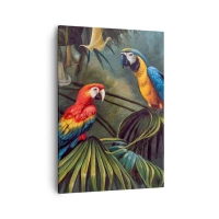 Fototapete Premium Canvas - Papageien in einem tropischen Wald mit exotischen Blumen im Hintergrund - 100x70cm - Romantik in den Tropen - Moderne Wanddekoration für Wohnzimmer und Schlafzimmer ARTTOR