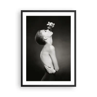 Poster in einem schwarzem Rahmen - Schwarz-Weiß-Porträt einer Frau mit Blumen - 50x70cm - Exzentrische Eleganz - Moderne Wanddekoration für Wohnzimmer und Schlafzimmer ARTTOR