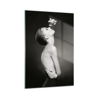 Glasbild - Bild auf glas - Eine Frau mit einer Blume im Mund in einem Schwarz-Weiß-Porträt - 50x70cm - Exzentrische Eleganz - Moderne Wanddekoration für Wohnzimmer und Schlafzimmer ARTTOR