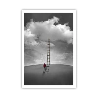 Glasbild - Bild auf glas - Eine Person in einem roten Mantel und eine Leiter, die zu einer Wolke führt - 70x100cm - Alles ist möglich - Moderne Wanddekoration für Wohnzimmer und Schlafzimmer ARTTOR