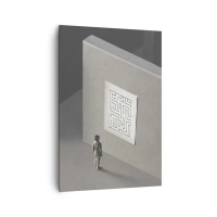 Glasbild - Bild auf glas - Eine Figur in einem Labyrinth, die auf eine hängende Karte schaut - 70x100cm - Aber wo bin ich? - Moderne Wanddekoration für Wohnzimmer und Schlafzimmer ARTTOR