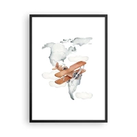 Poster in einem schwarzem Rahmen - Ein Doppeldecker über einer Weltkarte in den Wolken - 50x70cm - Im Pioniergeist - Moderne Wanddekoration für Wohnzimmer und Schlafzimmer ARTTOR