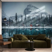 Fototapete Standard Eco - Ein verschneiter Wald und eine Berghütte an einem türkisfarbenen See - 100x70cm - Kanadischer Rückzug - Moderne Wanddekoration für Wohnzimmer und Schlafzimmer ARTTOR