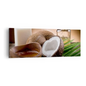 Bild auf Leinwand - Leinwandbild - Kokosnüsse, Kerze und Öl auf einem hölzernen Hintergrund - 140x50cm - Gesundheit von tropischen Inseln - Moderne Wanddekoration für Wohnzimmer und Schlafzimmer ARTTOR