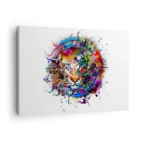 Fototapete Premium Canvas - Farbenfrohes Porträt eines Löwen im abstrakten Stil - 100x70cm - Es lauert hinter einem Regenbogenschleier - Moderne Wanddekoration für Wohnzimmer und Schlafzimmer ARTTOR