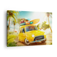 Bild auf Leinwand - Leinwandbild - Ein gelbes Auto mit Gepäck vor einer tropischen Landschaft - 70x50cm - Eine Reise für mehr als ein Lächeln - Moderne Wanddekoration für Wohnzimmer und Schlafzimmer ARTTOR