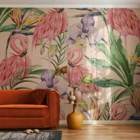 Fototapete Premium Canvas - Rosa Ballett in Blumen - Vogel, Flamingo, Dschungel - 300x210 cm
