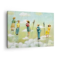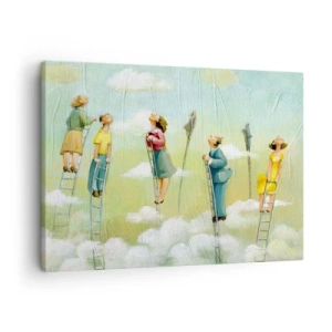 Bild auf Leinwand - Leinwandbild - Figuren, die auf pastellfarbenem Hintergrund zwischen Wolken Leitern hochklettern. - 70x50cm - Hinter deinem Traum - Moderne Wanddekoration für Wohnzimmer und Schlafzimmer ARTTOR