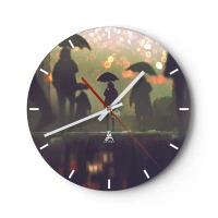 Wanduhr - Glasuhr - Eine Figur mit einem Regenschirm an einem regnerischen Abend zwischen den Lichtern der Stadt - 30x30cm - Aus der Perspektive eines Regentropfens - Moderne Wanddekoration für Wohnzimmer und Schlafzimmer ARTTOR