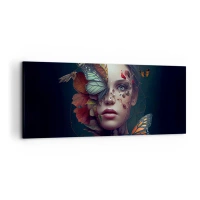 Bild auf Leinwand - Leinwandbild - Porträt einer Frau mit Schmetterlingen und Pflanzenelementen - 120x50cm - Wunderbare Metamorphose - Moderne Wanddekoration für Wohnzimmer und Schlafzimmer ARTTOR