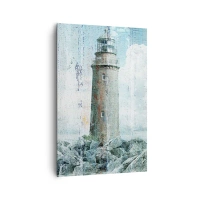 Bild auf Leinwand - Leinwandbild - Ein Leuchtturm an einer felsigen Küste in Pastellfarben - 80x120cm - Auf altem Holz - Moderne Wanddekoration für Wohnzimmer und Schlafzimmer ARTTOR