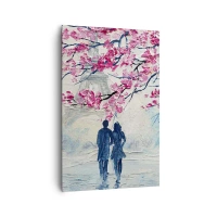 Bild auf Leinwand - Leinwandbild - Ein Paar unter blühenden rosa Bäumen in romantischer Umgebung - 80x120cm - Romantischer Spaziergang - Moderne Wanddekoration für Wohnzimmer und Schlafzimmer ARTTOR