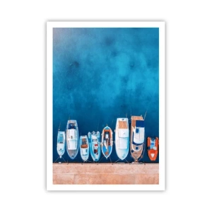 Bild auf Leinwand - Leinwandbild - Boote vertäut am Ufer vor dem blauen Wasser - 70x100cm - In einer Reihe - Moderne Wanddekoration für Wohnzimmer und Schlafzimmer ARTTOR