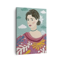 Poster - Porträt einer Frau in einem farbenfrohen, stilisierten Kleid vor einem Wolkenhintergrund. - 50x70cm - Mit Melancholie im Blick - Moderne Wanddekoration für Wohnzimmer und Schlafzimmer ARTTOR