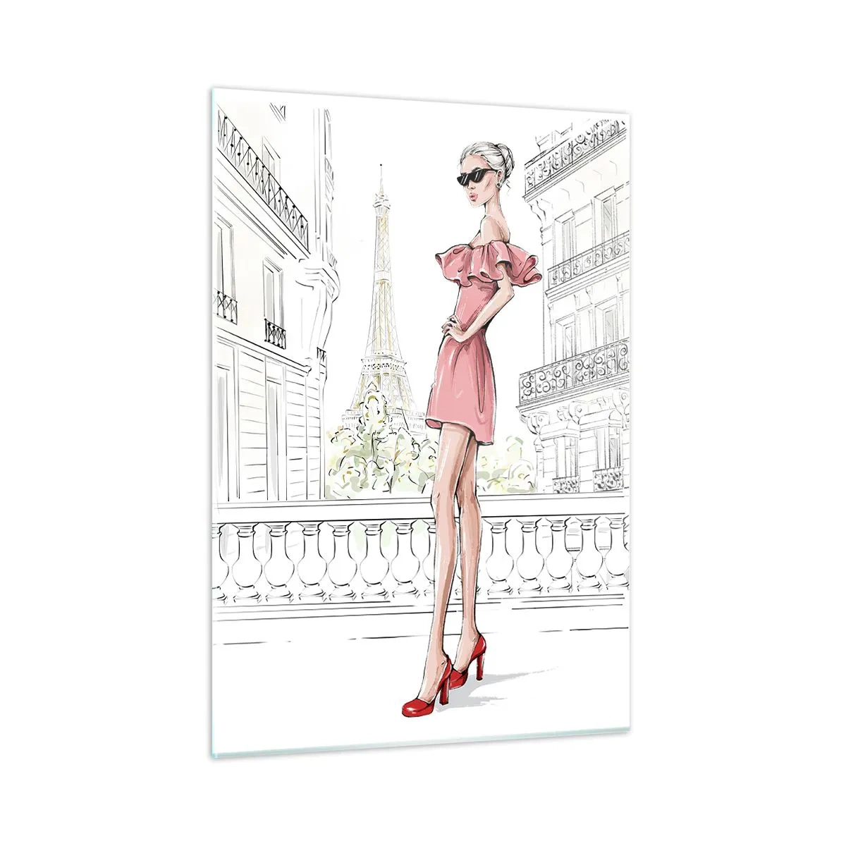 Poster - Eine elegante Frau in einem rosa Kleid mit dem Eiffelturm im Hintergrund - 50x70cm - Modekunst - Moderne Wanddekoration für Wohnzimmer und Schlafzimmer ARTTOR