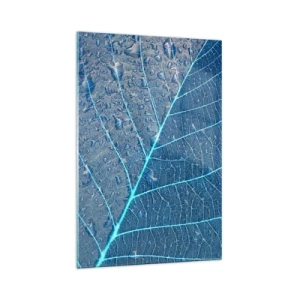 Glasbild - Bild auf glas - Ein Blatt in Blautönen mit Wassertropfen - 70x100cm - Leben in Blau - Moderne Wanddekoration für Wohnzimmer und Schlafzimmer ARTTOR