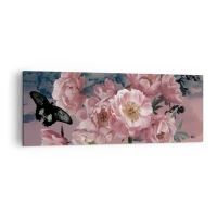Bild auf Leinwand - Leinwandbild - Rosa Pfingstrosen mit einem Schmetterling auf pastellfarbenem Hintergrund - 140x50cm - Der Höhepunkt der Romantik - Moderne Wanddekoration für Wohnzimmer und Schlafzimmer ARTTOR