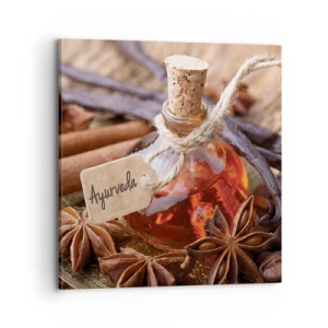 Glasbild - Bild auf glas - Eine Flasche Gewürzöl auf einem Tablett - 70x100cm - Zur Einheit von Körper und Geist - Moderne Wanddekoration für Wohnzimmer und Schlafzimmer ARTTOR