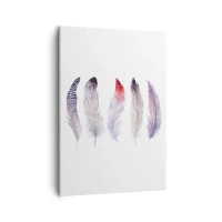 Bild auf Leinwand - Leinwandbild - Fünf zarte Federn in Pastelltönen auf hellem Untergrund - 50x70cm - Zart wie mehrfarbiger Nebel - Moderne Wanddekoration für Wohnzimmer und Schlafzimmer ARTTOR