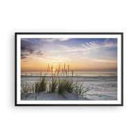 Poster in einem schwarzem Rahmen - Ein Sandstrand bei Sonnenuntergang mit Gras im Hintergrund - 100x70cm - Schau, denk, fühl - Moderne Wanddekoration für Wohnzimmer und Schlafzimmer ARTTOR