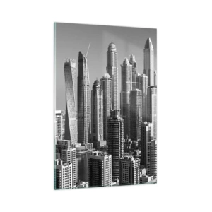 Glasbild - Bild auf glas - Panorama moderner Wolkenkratzer in monochromen Tönen - 80x120cm - Stadt in der Wüste - Moderne Wanddekoration für Wohnzimmer und Schlafzimmer ARTTOR