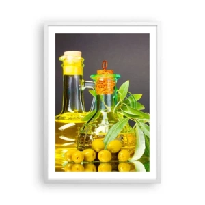 Poster in einem weißen Rahmen - Stillleben mit Oliven und Olivenöl - 50x70 cm