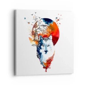 Bild auf Leinwand - Leinwandbild - Abstraktes Aquarell eines Wolfes vor einem roten Mond - 50x70cm - Nase an Nase mit der Nacht - Moderne Wanddekoration für Wohnzimmer und Schlafzimmer ARTTOR