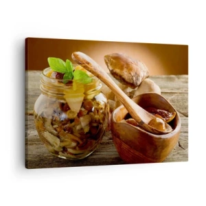 Bild auf Leinwand - Leinwandbild - Natürliche Pilze in einem Glas auf einem rustikalen Tisch - 70x50cm - Ob frisch oder gesalzen, oder in der Herbstsaison ... - Moderne Wanddekoration für Wohnzimmer und Schlafzimmer ARTTOR