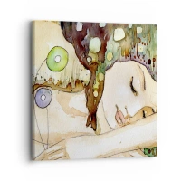 Glasbild - Bild auf glas - Eine schlafende Frau in einem künstlerischen Aquarellgemälde in warmen Farben. - 70x50cm - Ein smaragd-violetter Traum - Moderne Wanddekoration für Wohnzimmer und Schlafzimmer ARTTOR