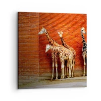 Bild auf Leinwand - Leinwandbild - Vier Giraffen vor einer Ziegelwand in künstlerischer Umgebung - 70x100cm - Sehen Sie Akazien? - Moderne Wanddekoration für Wohnzimmer und Schlafzimmer ARTTOR