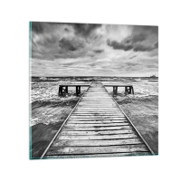 Bild auf Leinwand - Leinwandbild - Eine Schwarz-Weiß-Ansicht eines Holzstegs über einer stürmischen See. - 70x100cm - Ich warte darauf, dass der Wind wegjagt... - Moderne Wanddekoration für Wohnzimmer und Schlafzimmer ARTTOR