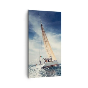 Glasbild - Bild auf glas - Ein Segelboot auf stürmischer See unter blauem Himmel - 80x120cm - Sie werden uns nicht einholen! - Moderne Wanddekoration für Wohnzimmer und Schlafzimmer ARTTOR