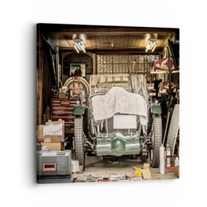 Glasbild - Bild auf glas - Vintage-Garage mit einem mit einem Tuch abgedeckten Auto, umgeben von Werkzeugen und Kisten - 50x70cm - Zurück in die Vergangenheit - Moderne Wanddekoration für Wohnzimmer und Schlafzimmer ARTTOR
