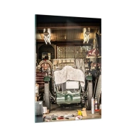 Glasbild - Bild auf glas - Ein altes Auto in einer Garage, umgeben von Werkzeugen und Geräten - 80x120cm - Zurück in die Vergangenheit - Moderne Wanddekoration für Wohnzimmer und Schlafzimmer ARTTOR