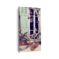 Glasbild - Bild auf glas - Vintage-Fahrräder vor einer Holztür mit pastellfarbenen Fensterläden - 80x120cm - Es lebe die Provinz - Moderne Wanddekoration für Wohnzimmer und Schlafzimmer ARTTOR