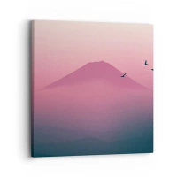 Bild auf Leinwand - Leinwandbild - Eine minimalistische Landschaft mit einem Berg und Vögeln bei Sonnenaufgang - 50x70cm - Wanderer über den Wolken - Moderne Wanddekoration für Wohnzimmer und Schlafzimmer ARTTOR