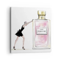 Bild auf Leinwand - Leinwandbild - Eine Frau in einem schwarzen Kleid neben einer Parfümflasche - 80x120cm - Essenz der Weiblichkeit - Moderne Wanddekoration für Wohnzimmer und Schlafzimmer ARTTOR