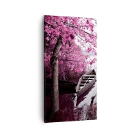 Bild auf Leinwand - Leinwandbild - Ein Boot am Ufer eines Sees zwischen rosa Bäumen - 80x120cm - In rosa Stille - Moderne Wanddekoration für Wohnzimmer und Schlafzimmer ARTTOR