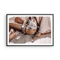 Poster in einem schwarzem Rahmen - Boho-Frau am Strand mit Schmuck - 100x70cm - Von den Wellen geworfen? - Moderne Wanddekoration für Wohnzimmer und Schlafzimmer ARTTOR