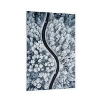 Glasbild - Bild auf glas - Eine Vogelperspektive auf eine kurvenreiche Straße in einem Winterwald - 80x120cm - Durch den Winterwald - Moderne Wanddekoration für Wohnzimmer und Schlafzimmer ARTTOR