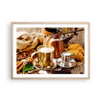 Poster in einem schwarzem Rahmen - Eine goldene Tasse Kaffee, umgeben von Bohnen, Krügen und Croissants - 100x70cm - Schönen Tag noch! - Moderne Wanddekoration für Wohnzimmer und Schlafzimmer ARTTOR