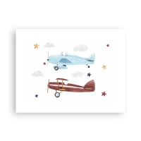 Poster - Handbemalte Flugzeuge vor einem Hintergrund aus Wolken und Sternen - 100x70cm - Wir warten, Herr Pilot! - Moderne Wanddekoration für Wohnzimmer und Schlafzimmer ARTTOR