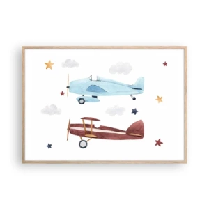Poster in einem schwarzem Rahmen - Handbemalte Flugzeuge vor einem Hintergrund aus Wolken und Sternen - 100x70cm - Wir warten, Herr Pilot! - Moderne Wanddekoration für Wohnzimmer und Schlafzimmer ARTTOR